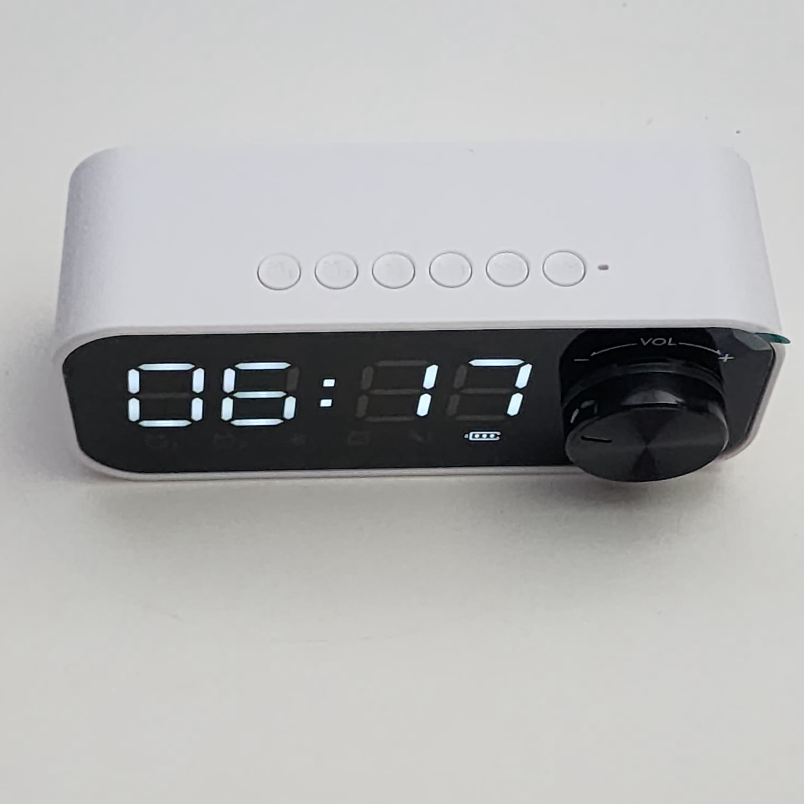 This sleek multifunctional digital alarm clock combines style and practicality in one compact design. Featuring a large LED display for clear time visibility, it also functions as a Bluetooth speaker for seamless music streaming. The integrated volume control knob ensures easy sound adjustment, while multiple control buttons provide quick access to its features. Perfect for your bedside, office desk, or living room.