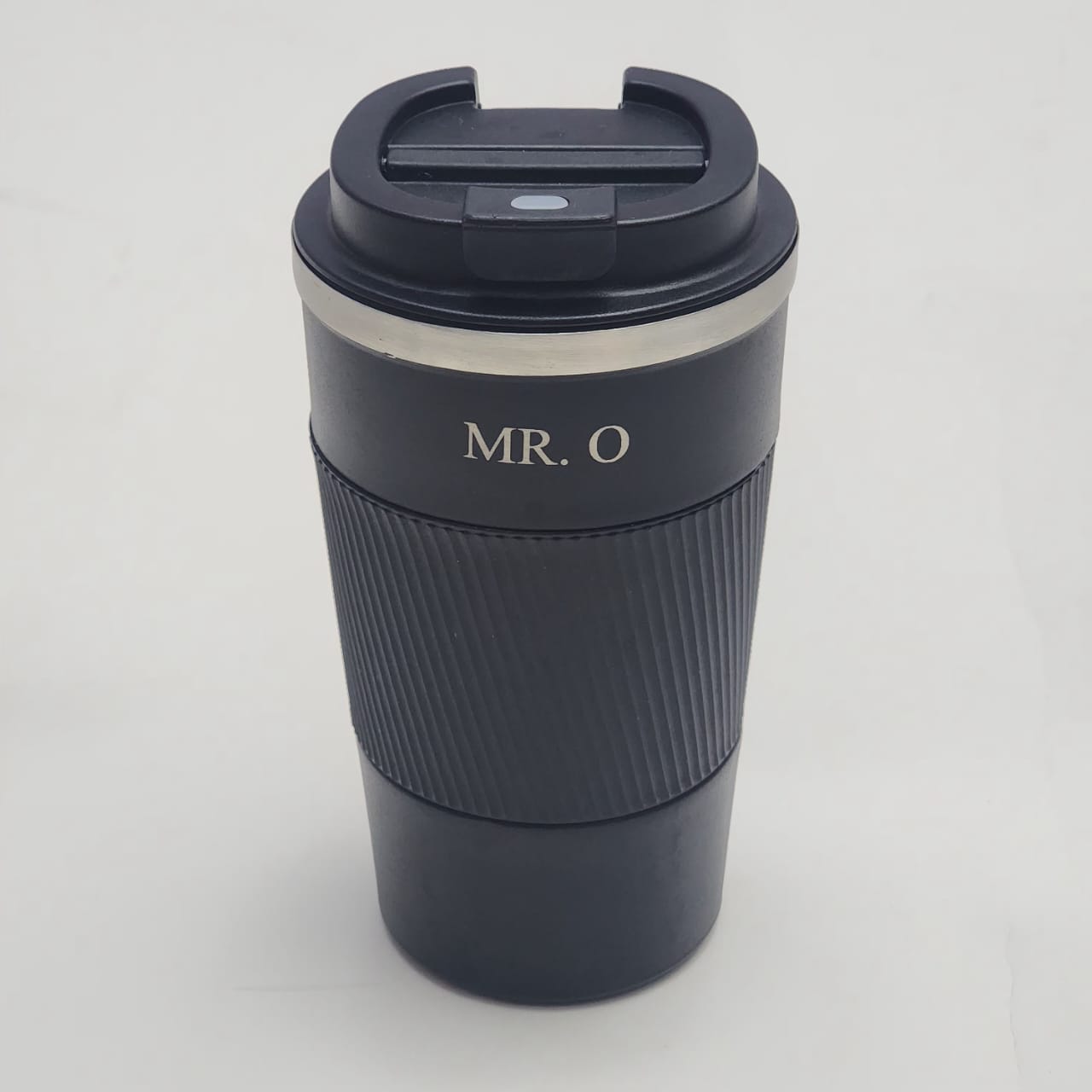 Personalized Black Travel Mug combines elegance with practicality. Designed with a sleek matte black finish and ribbed grip for comfort, it keeps beverages hot or cold for hours. The engraved “MR. O” personalization adds a refined touch, making it ideal for daily commutes, office use, or travel. Its spill-proof lid ensures mess-free sipping wherever you go.